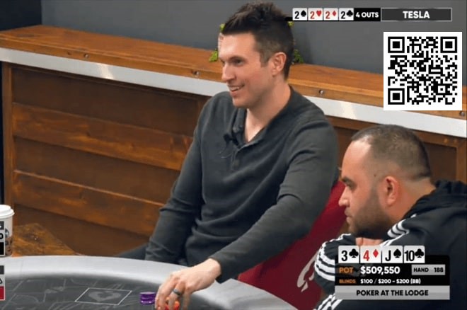 当直播进行了近9个小时,Doug Polk在9♥8♦Q♦的翻后以Q♣10♣全压$100,000,他的对手Tesla用8♠8♥秒call。两位玩家都同意发两轮,第一轮在转牌圈出现了10♠,河牌圈出现了5♠,对于翻牌三条的Tesla来说清清爽爽。